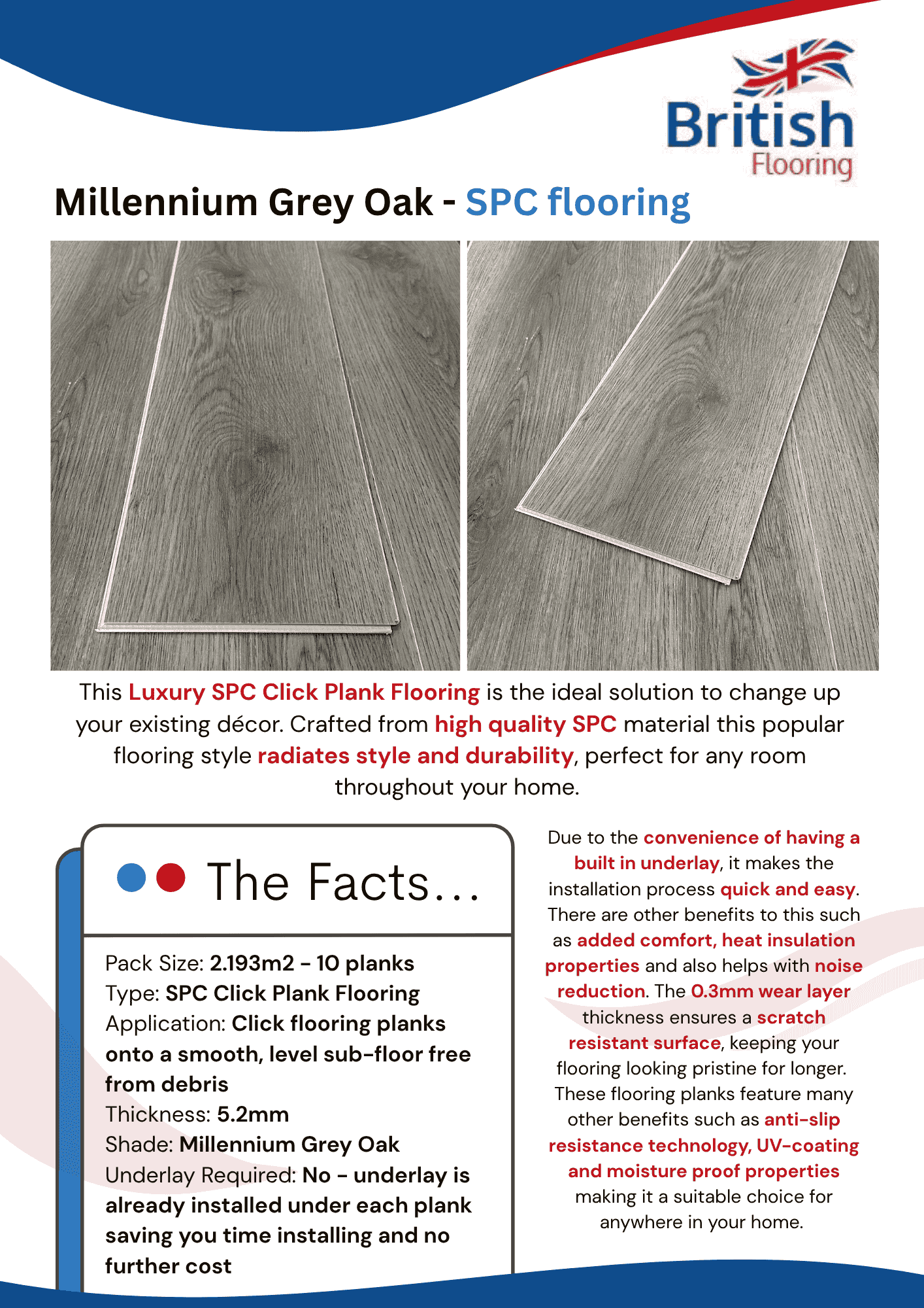 Upgrade your home with our Premium Millennium Grey Oak SPC Click Plank Flooring, designed to bring modern elegance and lasting durability to any space. Made from high-quality SPC material, these luxury planks provide a sleek, stylish finish that complements every room. Thanks to the built-in underlay, installation is quick, easy and hassle-free. The integrated underlay also adds comfort underfoot, improves heat insulation and reduces noise, making it ideal for busy homes.
