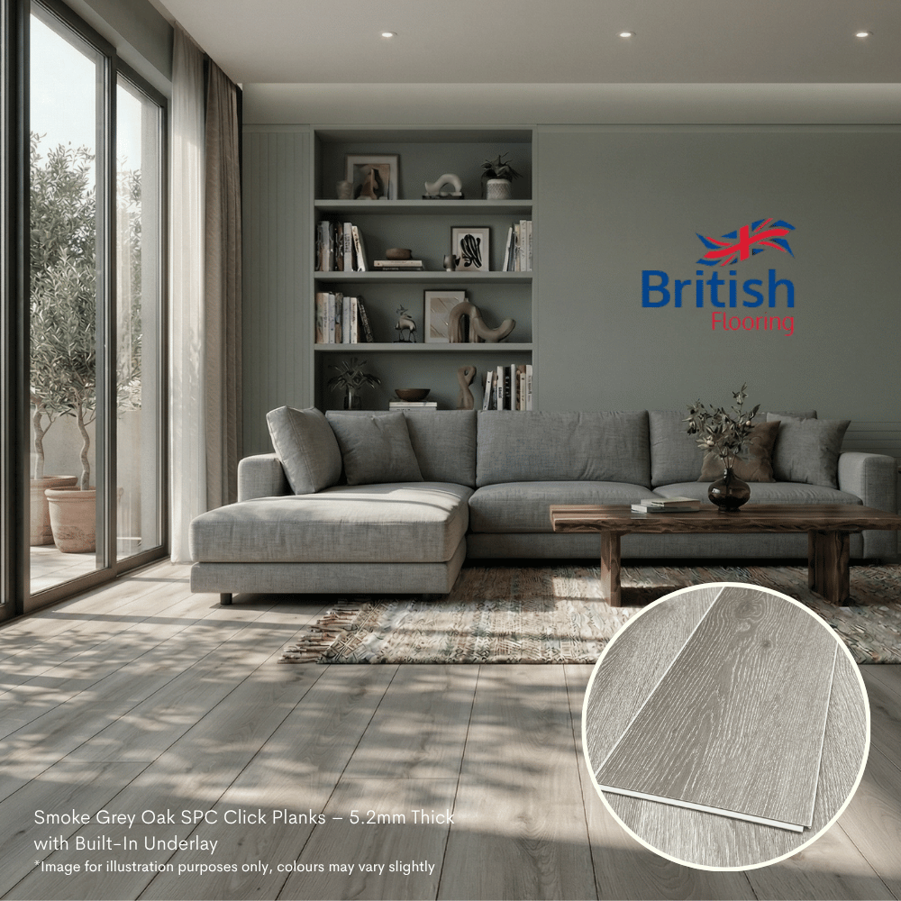 Smoke Grey Oak SPC Click Planks – 5.2mm Thick with Built-In Underlay